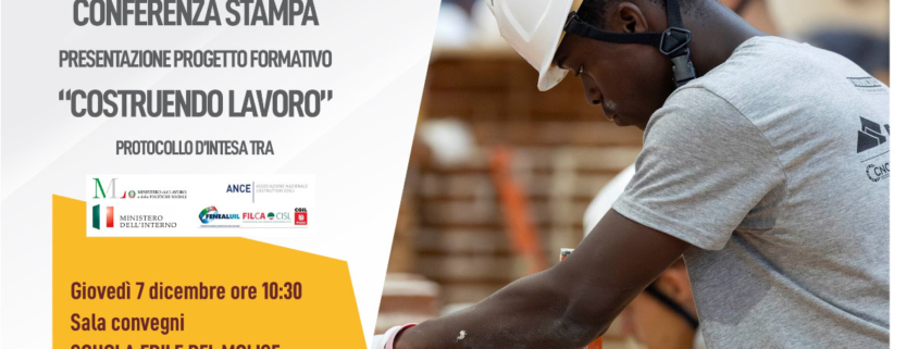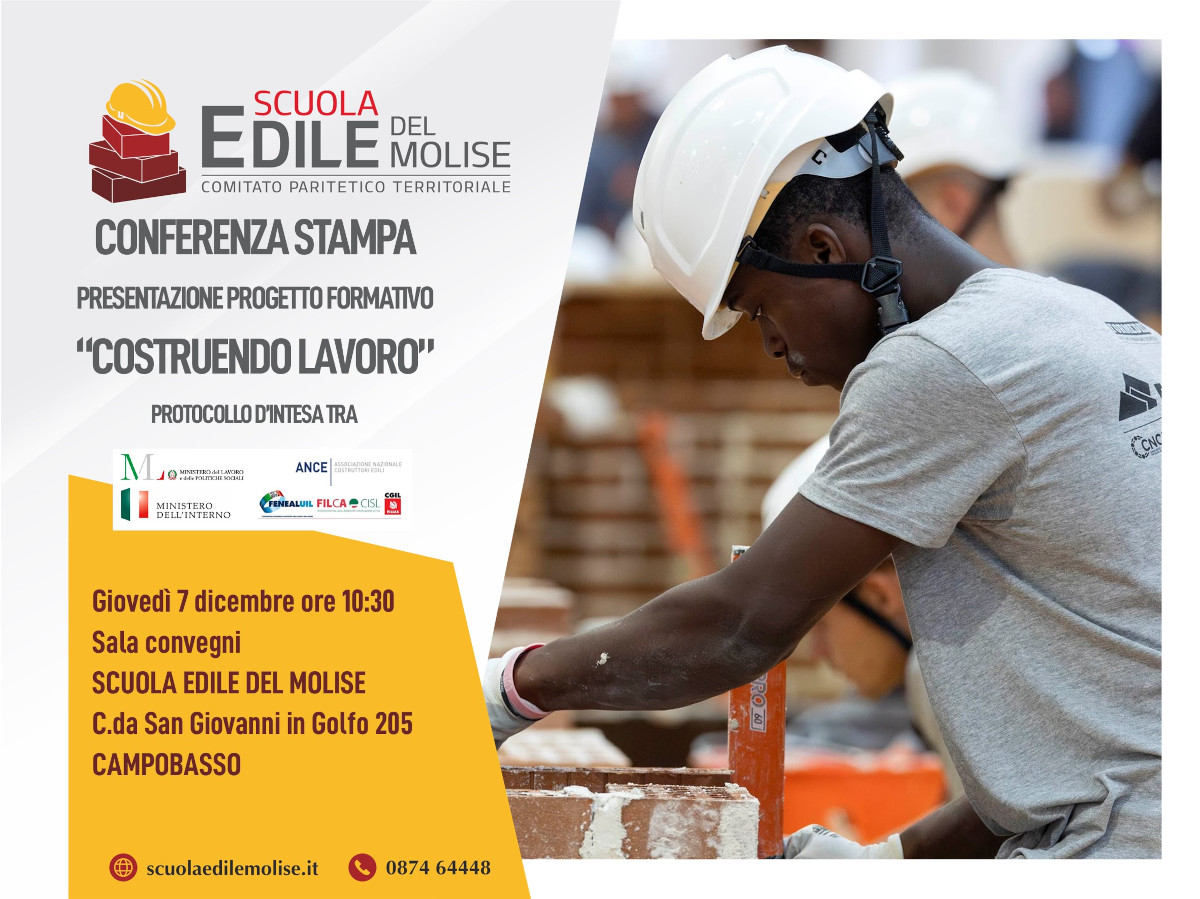 Informiamo che il prossimo 7 dicembre si terrà alle ore 10:30 presso la sala convegni dell’Ente, in via San Giovanni in Golfo 205 a Campobasso la conferenza stampa di lancio del percorso formativo “Costruendo lavoro” per favorire l’inserimento socio lavorativo di richiedenti e titolari di protezione internazionale e altri cittadini stranieri in condizioni di vulnerabilità, organizzato a seguito del Protocollo d’Intesa tra Ministero del Lavoro e delle Politiche Sociali, Ministero dell’Interno – Dipartimento per le libertà civili e l’immigrazione e Ance, Feneal – UIL, Filca – CISL e Fillea – CGIL.